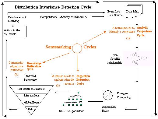The 1st cycle involves a human judgment regarding the development of an analytic conjecture.  Tacit knowledge of an expert is required as well as someone who has a sense of why the SLIP emergent computing might produce new information automatically.  The event log has one type of information. what SLIP does is to create an event category by the prefect recall of all event pairs that are "joined" by the analytic conjecture.  Example: if two attackers attack the same defender than there is a non-specific relationship.  If a chain relationship is identified within a collection of several thousand of these joined pairs, then an event category is identified.  The event category is not a statistical artifact, but rather a categorical artifact that uses graph theory related to the emergent aspects of the linkages.