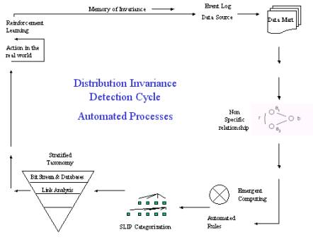 A Distributed Invariance Detection Cycle is an automated process that uses compression and categorization, rule bases, and Petri nets to produce a computational immune system.  As seen from the point of view of the four layer stratified taxonomy, the Distributed Invariance Detection Cycle algorithmically derive bit stream and intrusion summary data acquisition.