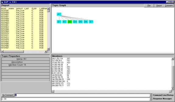 1)       On the surface one might be skeptical about the notion that attacker IPs would tell us anything.  However, we are only bringing into the analysis attacker IPs that are linked by the common use of ports.  We also must realize that the RealSecure database only logs events that have been determined to have hacker significance.  The data is greatly reduced from the total number of possible transactions. The Analytic Conjecture organizes the data in a specific fashion.  It is like SQL retrieval.   Looking at the results of this conjecture takes very little time and the view of this data may result in some instant understanding that was not present before the inspect of the SLIP Framework.