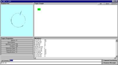 The Topic Properties in Figure 8 indicate that 400,000 iterations have been applied to the distribution.  This process takes about 43 seconds on a slow Compaq computer.  The clustering process is interesting to watch and can be stopped at any time.  The distribution state is updated once every n iterations where n is a parameter.   Once stopped, new categories can be manually defined and inspected.