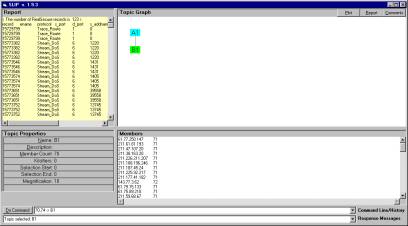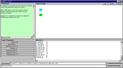 Using the demonstration software we produced a cluster with 18 IP addresses.  Retrieval from the data mart and data warehouse (in this case the RealSecure summary log file) produced several hundred events.  The events are a few Windows_Access_Error and hundreds of Port_Scan and hundreds of DoS_Stream.