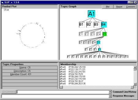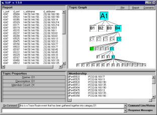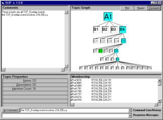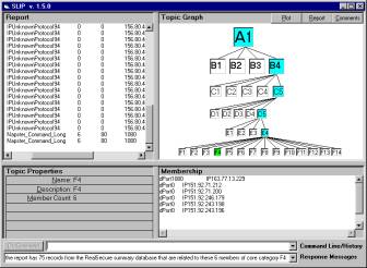 In figure two we see the SLIP interface version 1.6 (October 17th, 2001).  By scrolling the top left window we would see that a RealSecure IDS classified each of the 24 elements of category D1 as a Trace Route event.  The only computational means for gathering these elements together is the non-specific relationship between Source IP plus Source Port and Target IP plus Target Port.