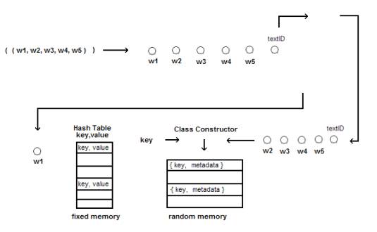 In Figure 3 we show the architecture in which frames gather together the co-occurrence of words into a collection of relationships having the form < a, r, b > where a and b are words and r is the relationship of a and b occurring within a sentence. Simple link analysis then leads directly to the Subject Matter Indicator neighborhoods in a graphical constructions which is the graph representation of the set { <a, r, b> } gathered over the entire text corpus.