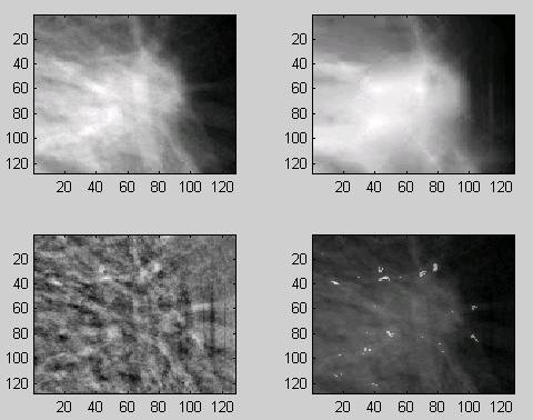 In running the experiment that produced Figure 1, we had no control over the selection of the IFS. The upper left corner image is the original normalized and cleaned windowed image from the GMAI image database. The upper right hand image is the fixed point of a IFS generated by the Iterated System’s commercial software (with a parameter set to encode only 80% of the resolution). The image in the lower left corner is the difference between the two upper images. This difference represents the part of the image having the greatest loss of original resolution. The lower right image is an enhancement of specific small areas where the local self-similarity is greatly different from the global self-similarity.