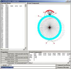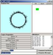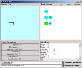 Once the SLIP atoms are scattered to the circle, one may command the browser to self organize into clusters. In less than 20 seconds around 100 million machine cycles are used to produce the emergent topology seen in the left windowpane of Figure 2. The command 123,128 -> B1 brings 1133 of these atoms from the spike cluster into a category B1.